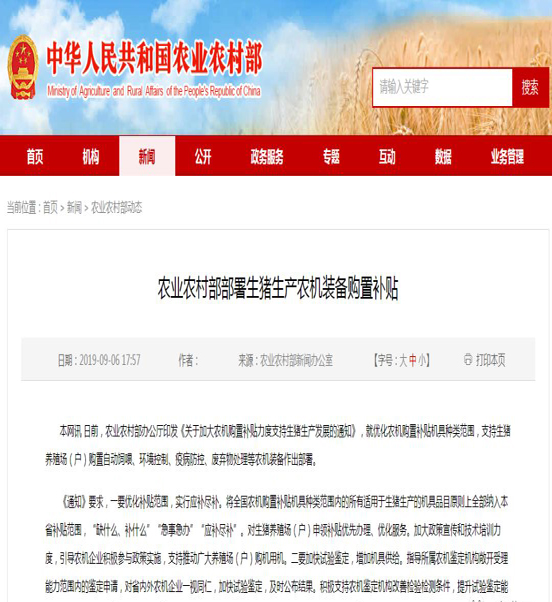 農業農村部辦公廳日前印發《關于加大農機購置補貼力度支持生豬生產發展的通知》,就優化農機購置補貼機具種類范圍,支持生豬養殖場(戶)購置自動飼喂、環境控制、疫病防控、廢棄